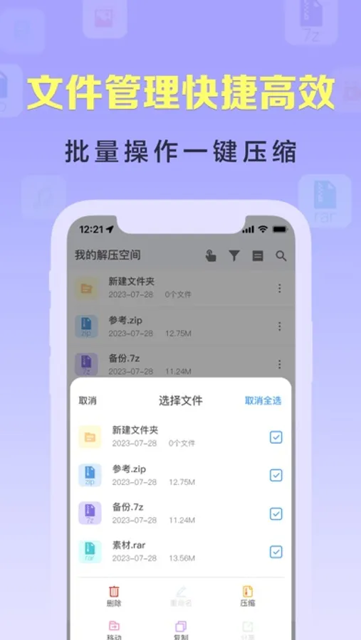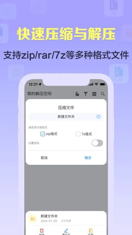 压缩软件-是一款专业的压缩解压缩办公软件。快速解决手机上查看Zip、RAR、7z等压缩文件的问题;可一键压缩文件、整理文件。支持外部导入视频、图片、文档、音频、文本等,也可以APP内新建文件及拍照进行压缩。