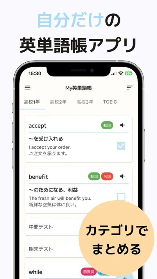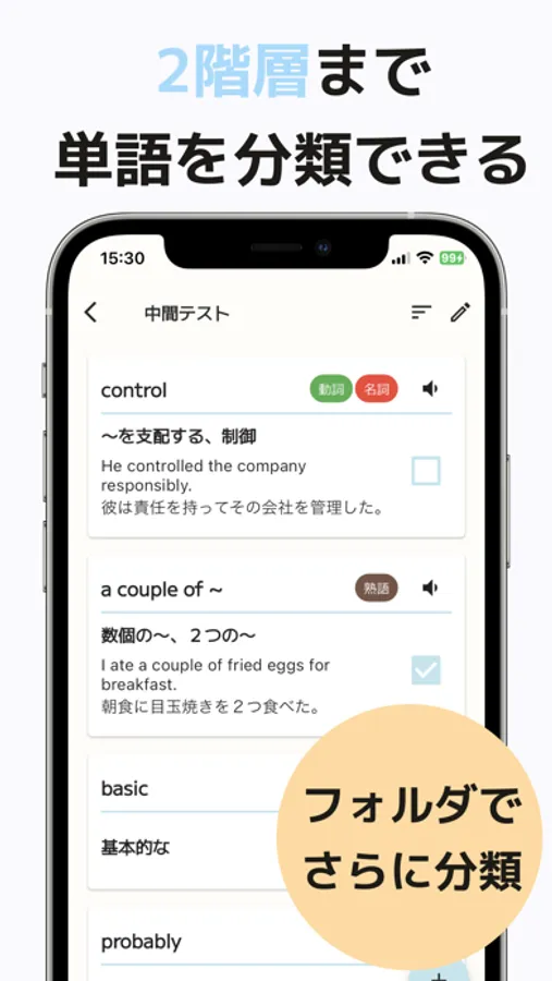 カテゴリとフォルダ機能を使って、単語を2階層まで分類できます。