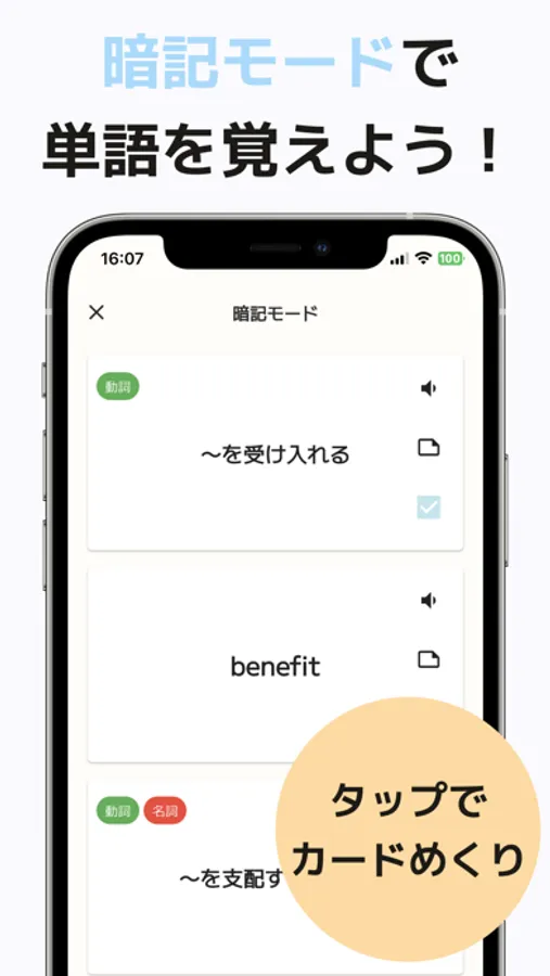 カードの表面と裏面をめくることができるので、本物の単語帳のような体験を味わうことができます。