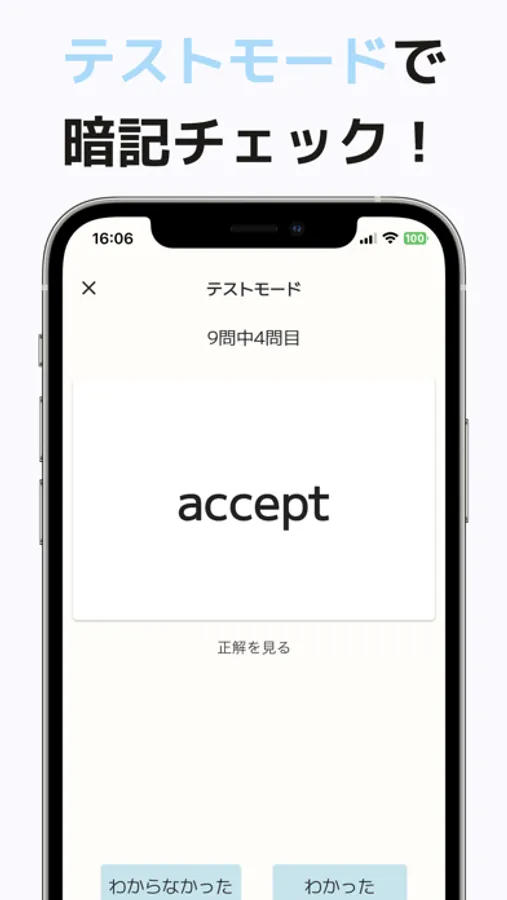 テストモードを使えば、単語が暗記できているかチェックすることができます。