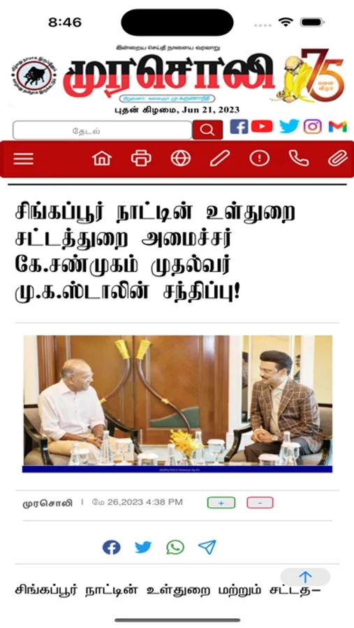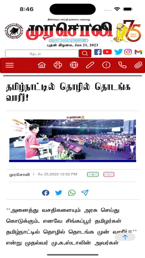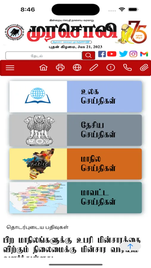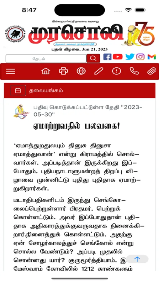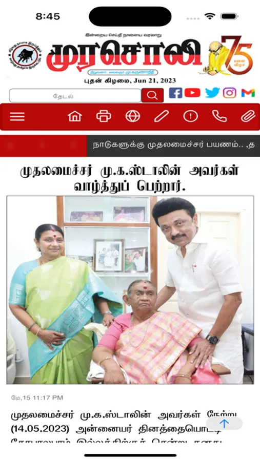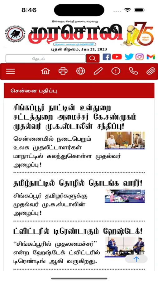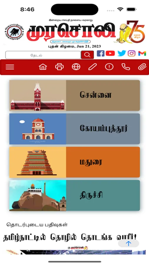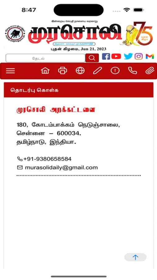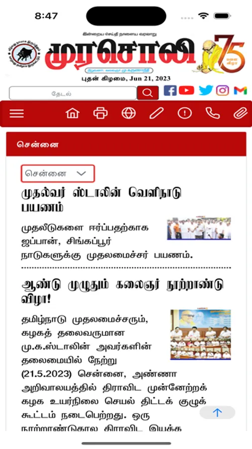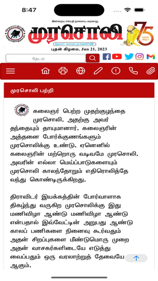 Murasoli was started in Tiruvarur on 10 August 1942, during the World War II, by 18-year old M. Karunanidhi. Its earliest editions were in form of handwritten notices authored by Karunanidhi under the pen name "Cheran". The newspaper headquarters were moved to Chennai in 1954. From 17 September 1960, it has been published as a daily. As of 2017, the newspaper has a circulation of 70,000 copies.
