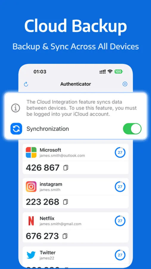Every piece of data in Authenticator is encrypted, ensuring your 2FA codes remain secure. Even when saved in the cloud, your data remains private and solely accessible by you.