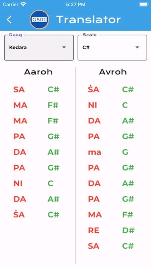 Translator tool allows selecting one of the 31 raags from Sri Guru Granth Sahib and the scale (such as C#, D#, A#, and so on) and it shows Aaroh and Avroh of that raag in the selected scale. This is useful for instrument tuning or for quick reference of notes in the raag.