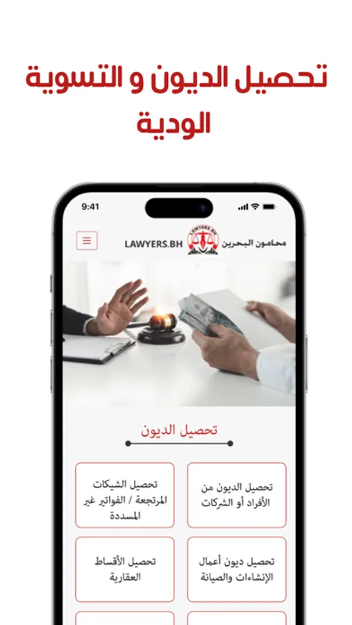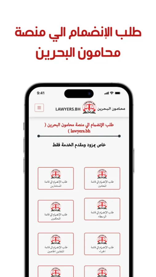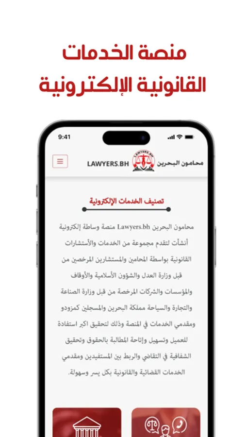 محامون البحرين Lawyers.bh منصة وساطة إلكترونية أنشأت لتقدم مجموعة من الخدمات والأستشارات القانونية بواسطة المحامين والمستشارين المرخصين من قبل وزارة العدل والشؤون الأسلامية والأوقاف والمؤسسات والشركات المرخصة من قبل وزارة الصناعة والتجارة والسياحة مملكة البحرين والمسجلين كمزودو ومقدمي الخدمات في المنصة وذلك لتحقيق اكبر استفادة للعميل وتسهيل وإتاحة المطالبة بالحقوق وتحقيق الشفافية في التقاضي والربط بين المستفيدين ومقدمي الخدمات القضائية والقانونية بكل يسر وسهولة.