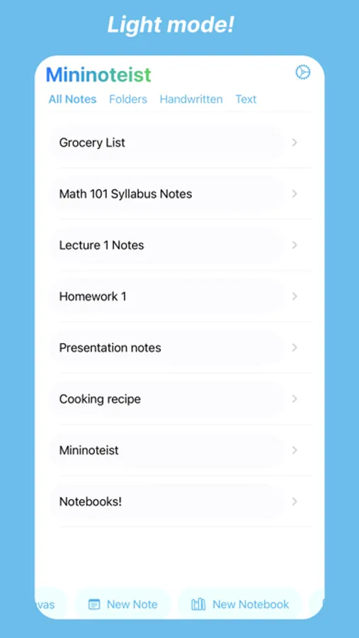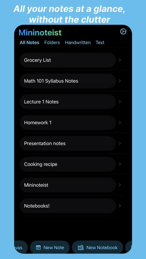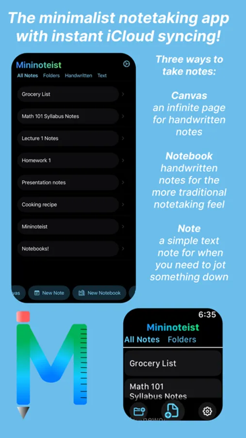 Mininoteist is a notetaking app, without all the clutter. No matter what situation you may need it for, Mininoteist has you covered. Wether you're jotting down lecture notes on your iPad, or if you're preparing for a big speech with your Apple Watch, or you're going grocery shopping with your iPhone, you'll never be left without an option. On top of all of this, notes live sync in a matter of seconds between devices as long as they are on the same iCloud account.