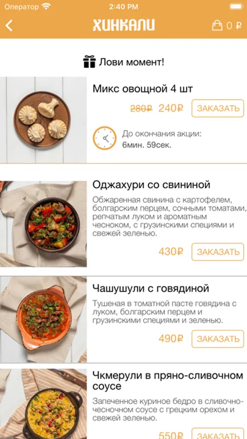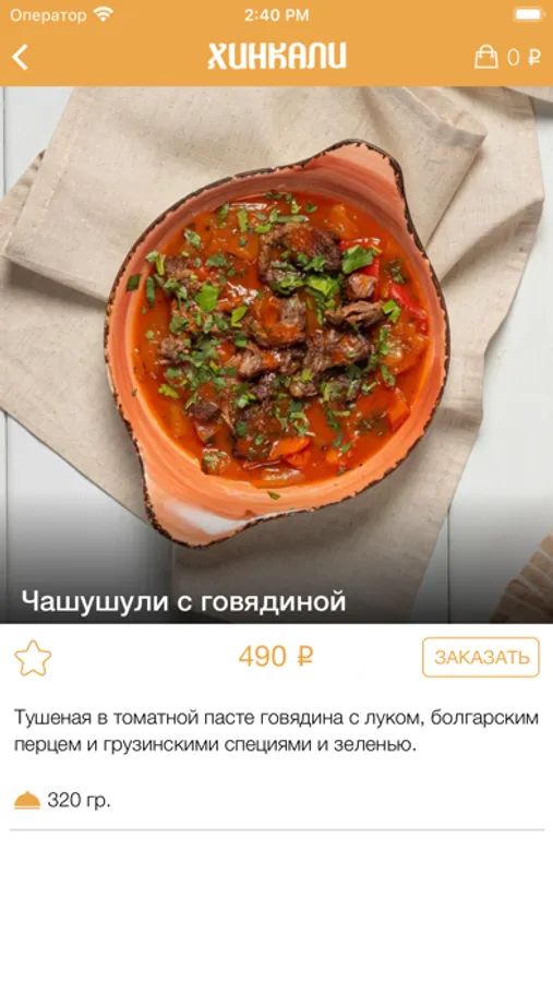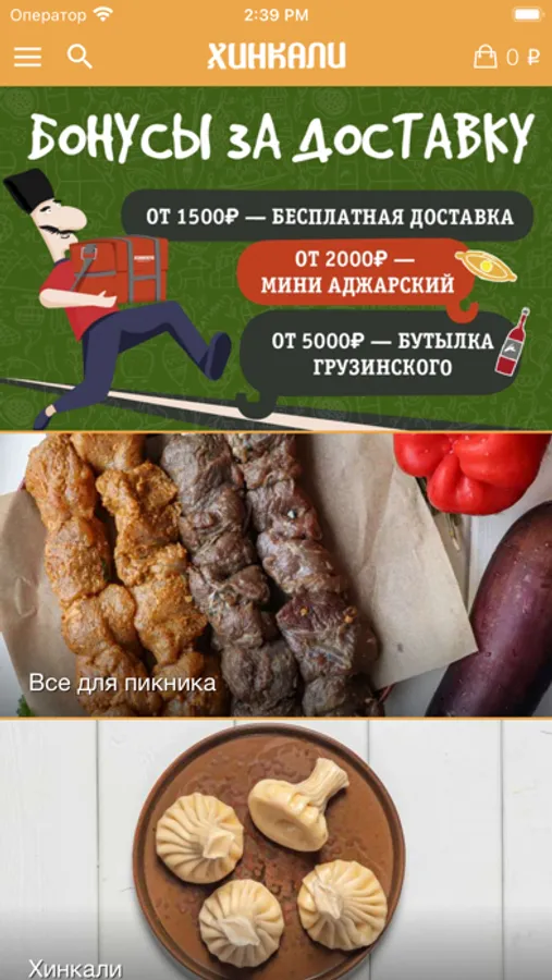 Приложение ресторана «Хинкали» позволяет оформить доставку заказа домой или в офис.
