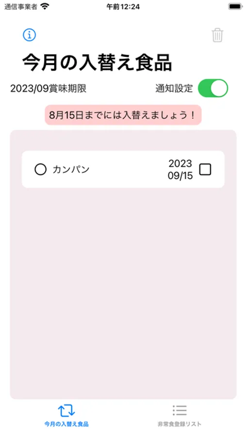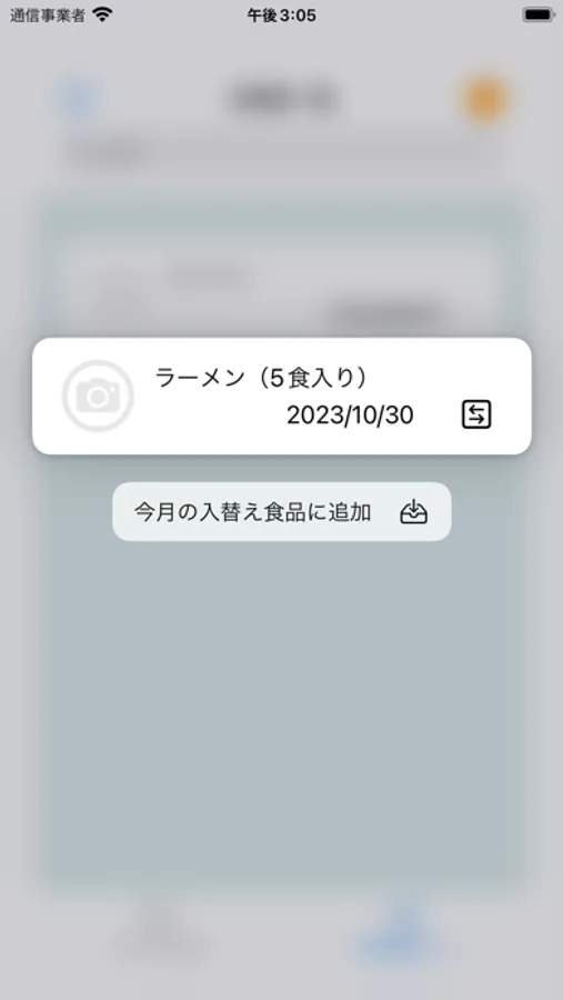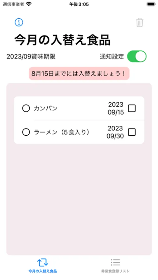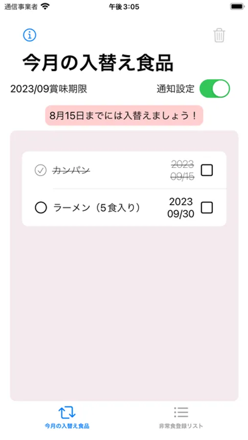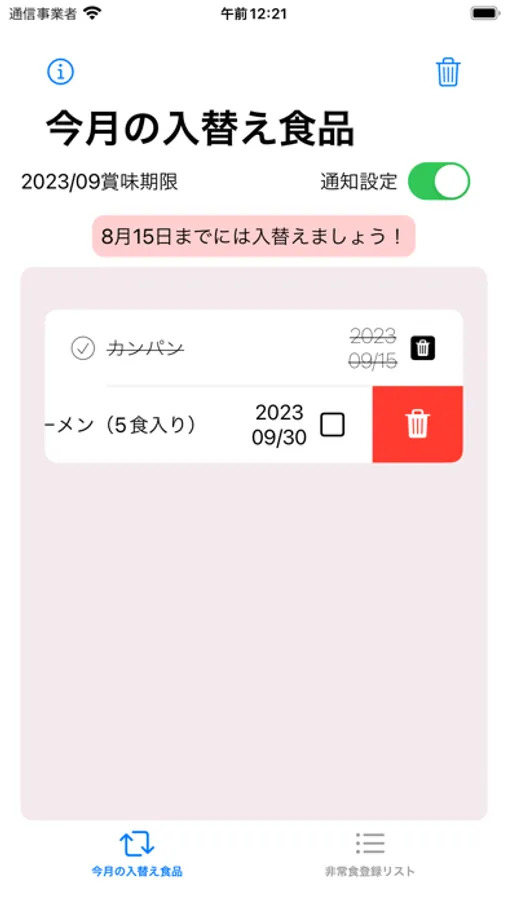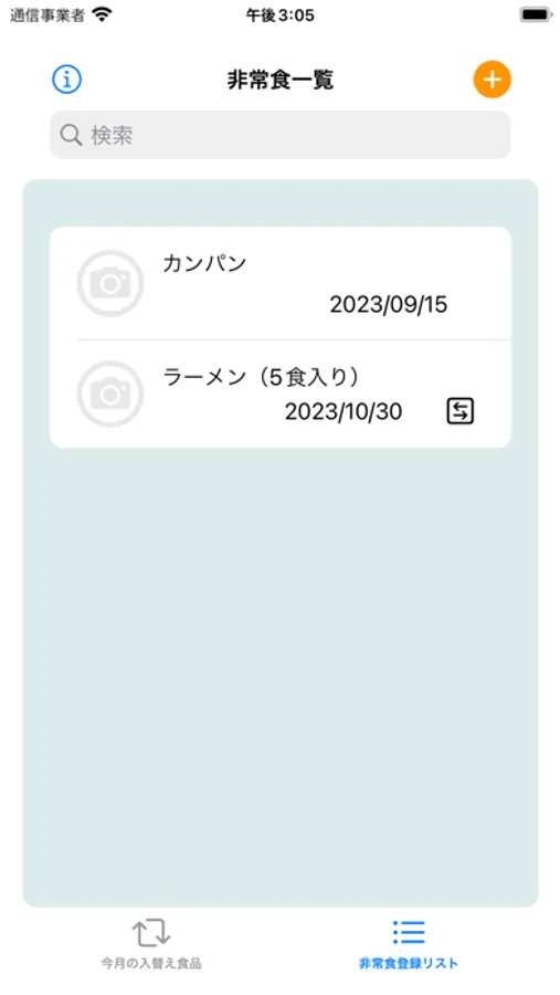 ご家庭でストックしている非常食の写真(任意)、食品名、賞味期限を登録すると、入れ替え時期がきた食品をお知らせしてくれます。非常食の一覧表は検索もできますので、何がストックされているのかが一目でわかります。まだ入れ替え時期ではない食品を出したい場合は、今月の入れ替え食品の一覧へ移動させることもできます。買い物リストにもなりますので、買い忘れがありません。また、買わなくてもいいものは削除できます。食品を削除すると両方のリストからその食品が削除されます。