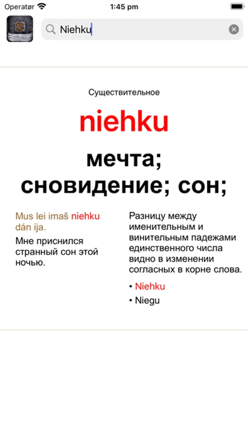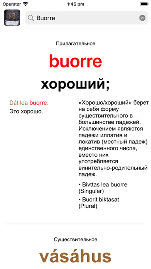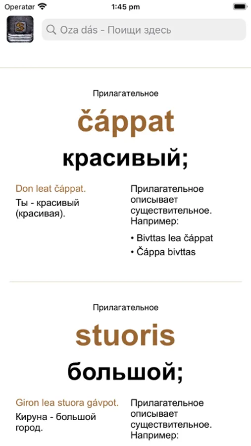 Этот учебный словарь – приложение, которое содержит примерно 1300 самых распространённых слов северосаамского языка. Саамские слова, простые фразы и предложения переведены на русский язык. Это приложение создано для носителей русского языка, которые хотят познакомиться с основами саамского языка. Этим приложением могут пользоваться также носители саамского языка, начинающие изучение русского языка. Приложение содержит функцию быстрого поиска слов. В приложение включены самые наиболее употребляемые глаголы, существительные, наречия, прилагательные, частицы, числительные и местоимения.