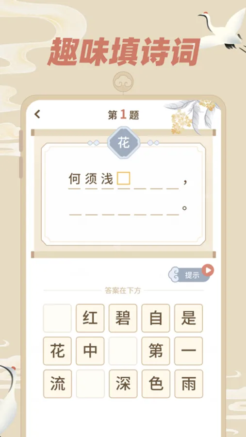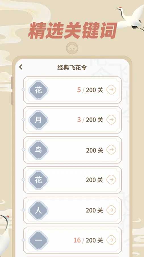 【经典飞花令】精选了50个关键字的飞花令列表,通过填完诗句完成闯关;