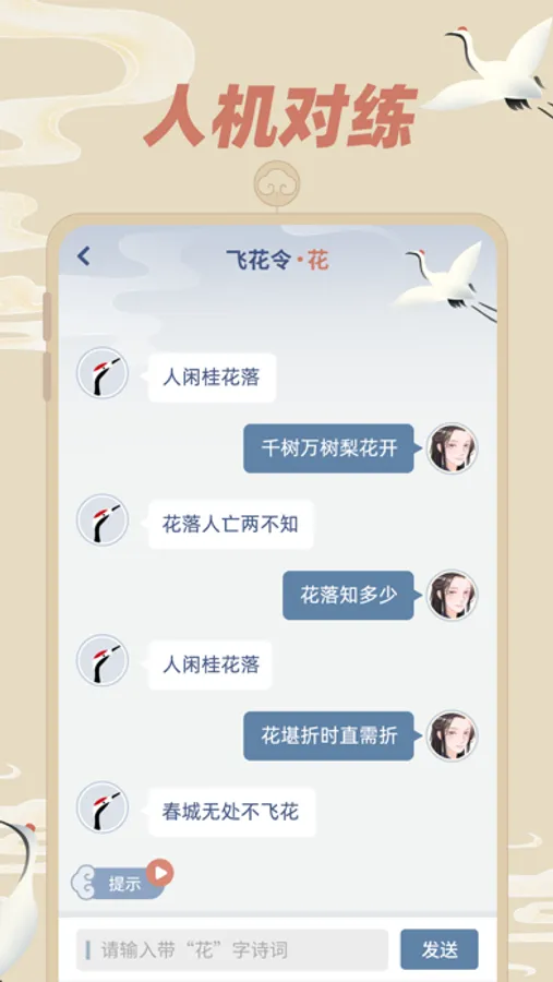 【人机对战】选取某一个关键字后,与人机一起对战飞花令,挑战自己的极限飞花令知识储备,迅速提高飞花令水平。
