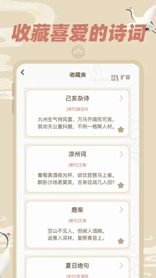 4.本软件对诸多诗词都加入了注释及作者介绍,用户可以收藏感兴趣的诗句,方便后续查看学习。