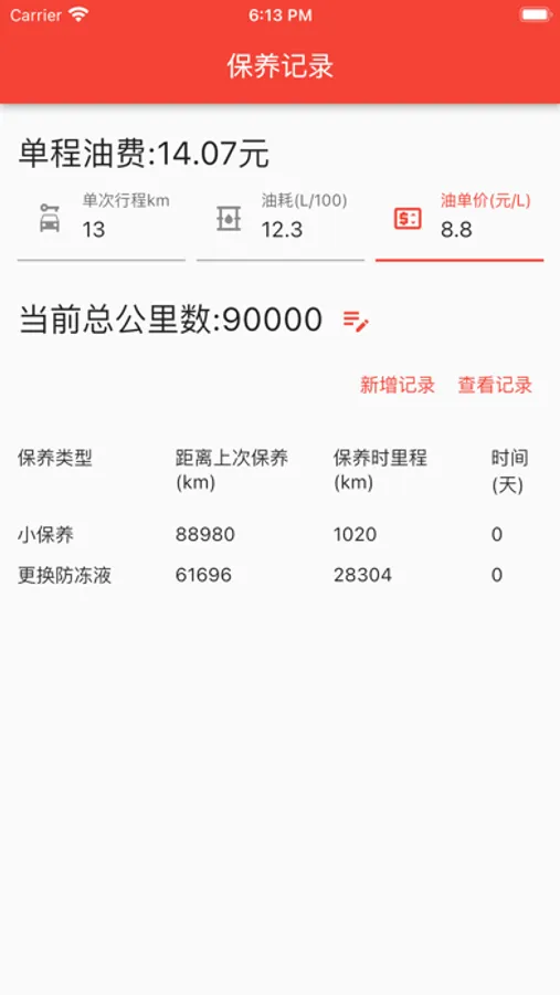 另外软件中还包含一个计算单次开车费用的功能,需要您录入本次行驶的油价、油耗、公里数。