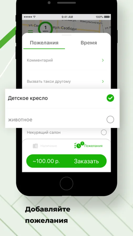 Добавьте к заказу дополнительные пожелания. Например, если вы не переносите запах табака — укажите "Некурящий салон", и к вам приедет некурящий водитель.