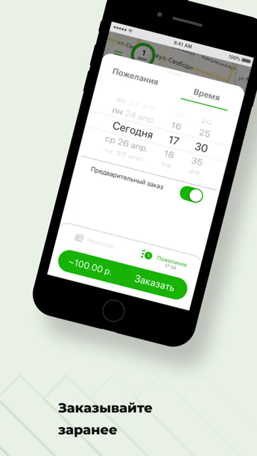 Выберите опцию “Предварительный заказ”. Поиск автомобиля начнется незадолго до заказа поездки, и автомобиль приедет к назначенному времени. Также вы будете заранее знать стоимость поездки.
