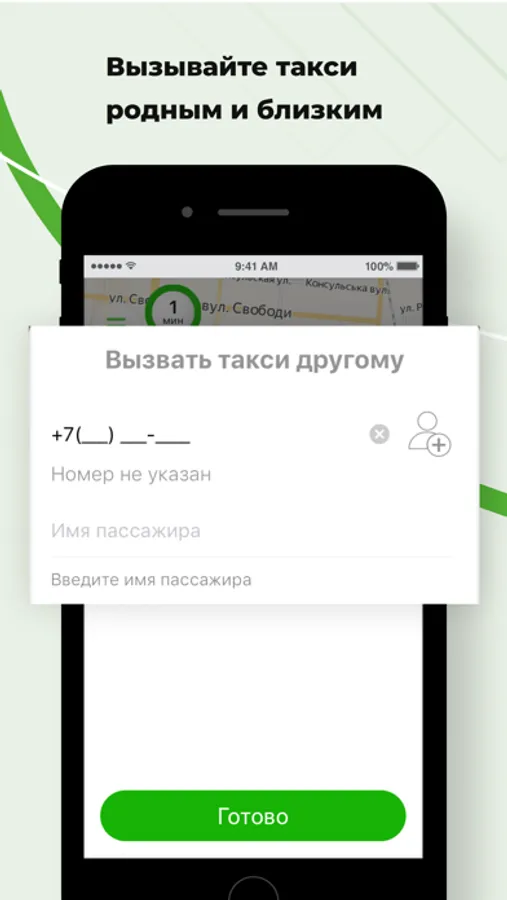 Используйте опцию “Вызвать такси другому” в разделе “Пожелания” и укажите его номер телефона. Когда такси подъедет, на указанный номер придет СМС, а вам — сообщение в приложении.