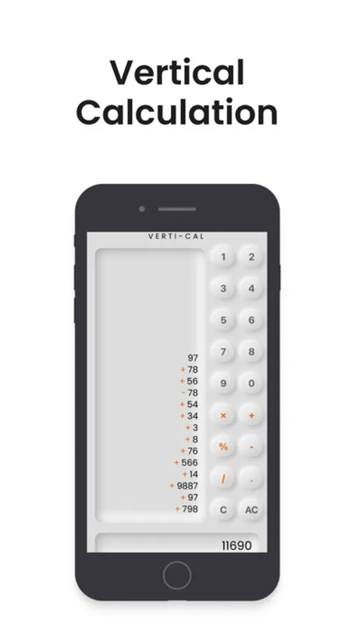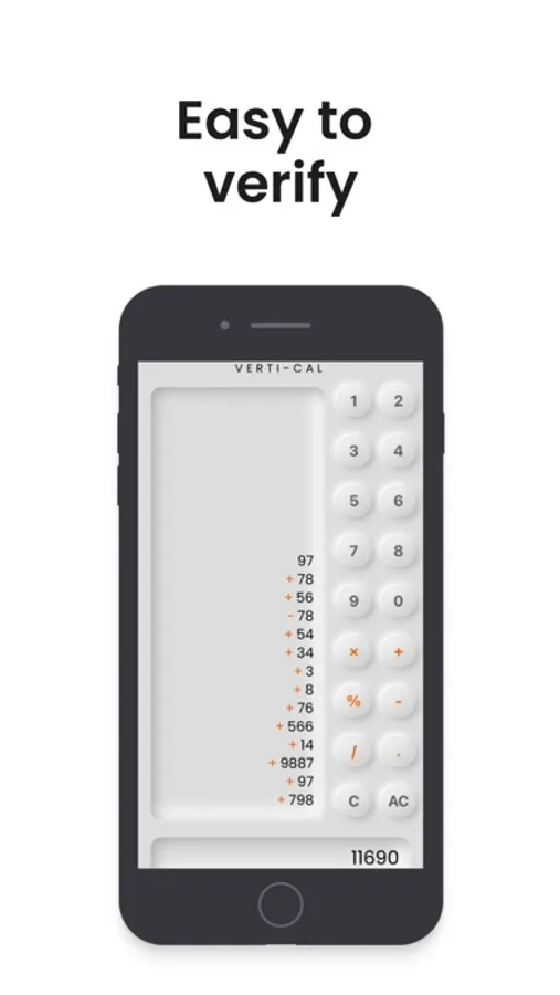 Introducing Verti-Cal, a refreshing take on the standard calculator. In today's digital age, it's crucial to be confident in every figure you enter, and that's where Verti-Cal stands out. Unlike other calculator apps that lack a clear vertical section for calculations, Verti-Cal presents you with an extended vertical view, allowing you to see and verify over 30+ figures from your entire calculation process. No more second-guessing your entries or losing track of numbers. With Verti-Cal, ensuring accuracy has never been simpler. Upgrade your calculation experience with Verti-Cal today.
