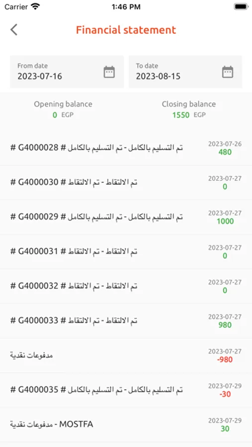 • كشف حساب العميل به تفاصيل المعاملات المالية