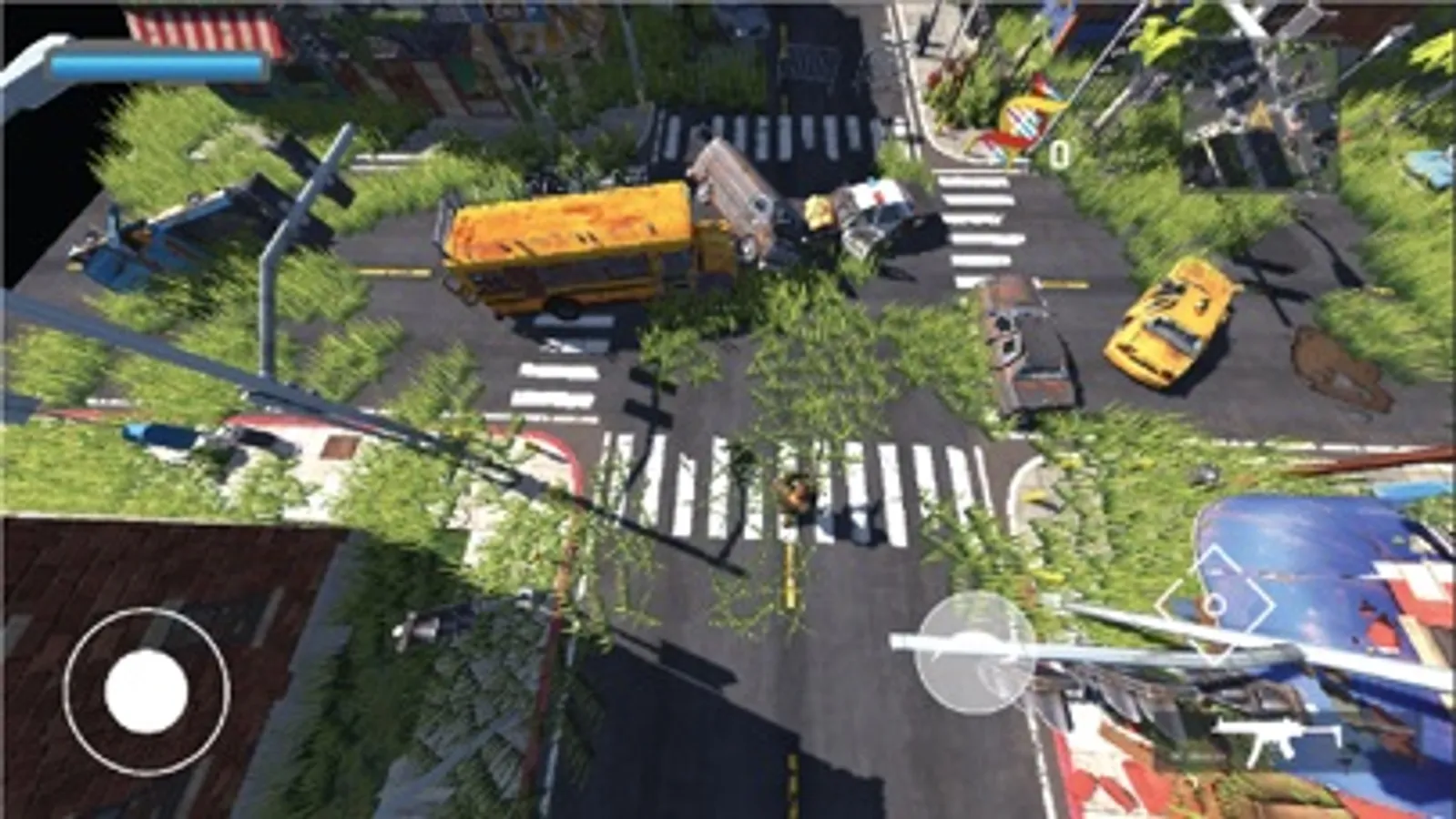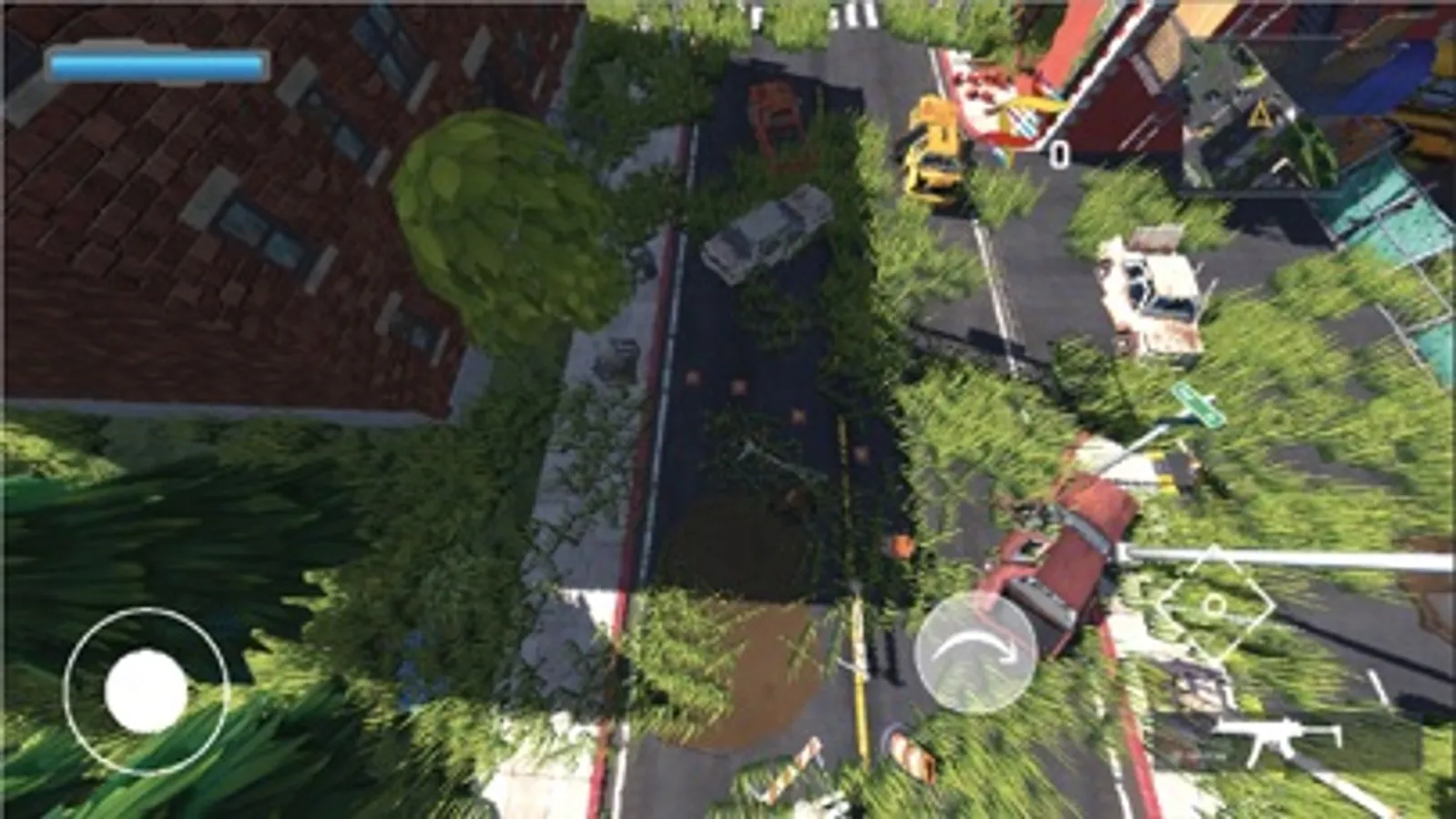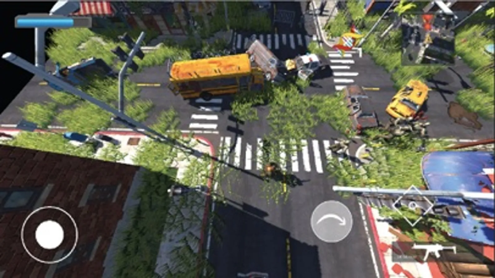 Use the joystick to navigate, tap anywhere on the screen except the buttons to rotate the character in the direction you want to move and navigate the bullets fired from the gun. Use roll over and shoot to dodge and kill zombies.