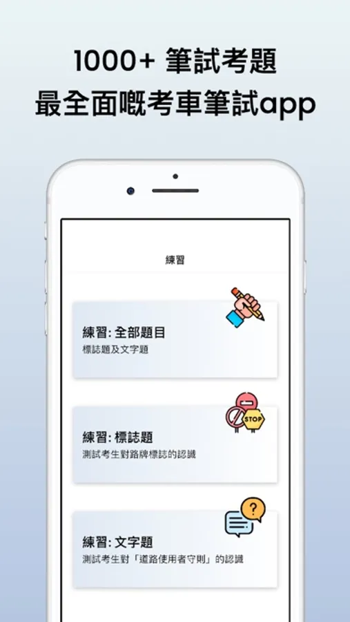 收集愈1000題過往筆試例題及精選試題,完全免費使用。題目分為標誌題及文字題,內容完全符合最新運輸處筆試範疇,助您做好考試準備。