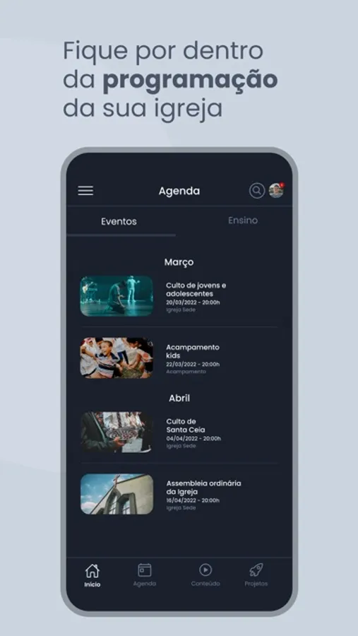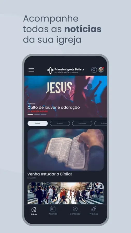 Recursos disponíveis no Aplicativo: Notícias, Agenda da igreja, Eventos, Conteúdos, Projetos, Transmissão ao Vivo e Módulo Ensino.