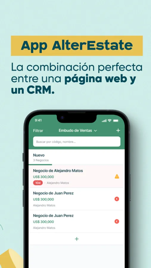 AlterEstate es la plataforma de Gestión Inmobiliaria más completa de Latino America. Permitiéndote administrar tu negocio inmobiliario desde la palma de tu mano con un poderoso CRM enfocado al sector inmobiliario, Administrador de Propiedades, Red Inmobiliaria, Sitios Webs Inmobiliarios, Formularios dinámicos, herramientas de Marketing y Contabilidad.