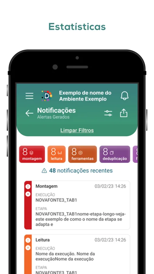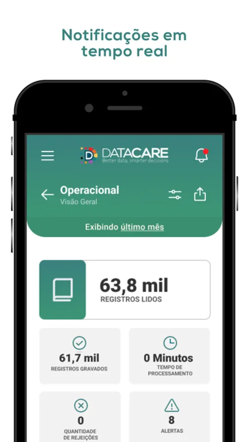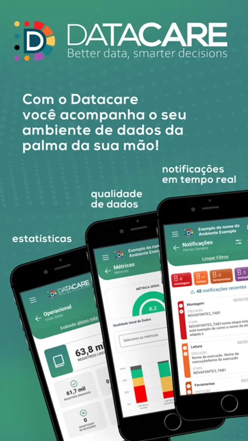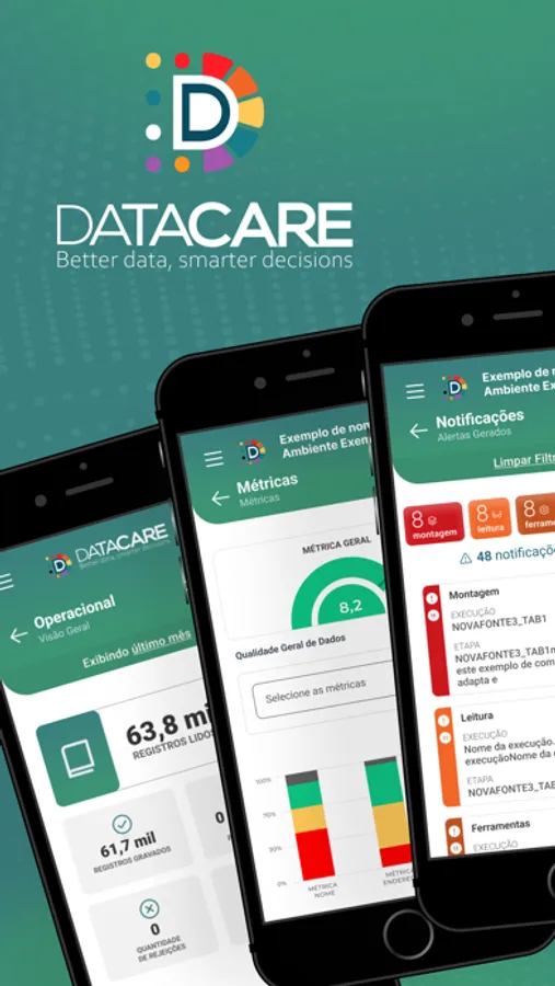 Evolução das métricas de qualidade de dados, estatísticas, status e notificações dos fluxos de processamento. Datacare na palma da sua mão