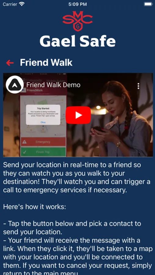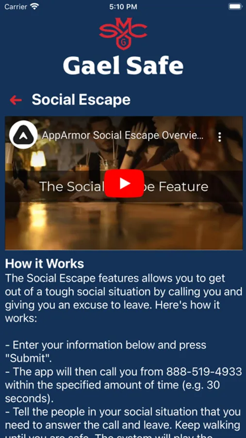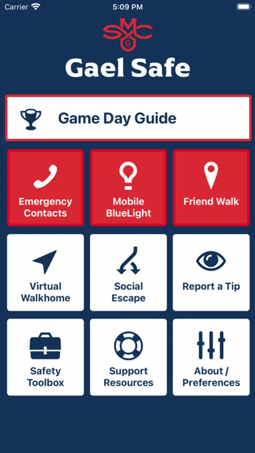 Gael Safe is the official safety app of Saint Mary's College of California. It is the only app that integrates with Saint Mary's College of California's safety and security systems. Campus Security has worked to develop a unique app that provides students, faculty and staff with added safety on the Saint Mary's College of California campus. The app will send you important safety alerts and provide instant access to campus safety resources.