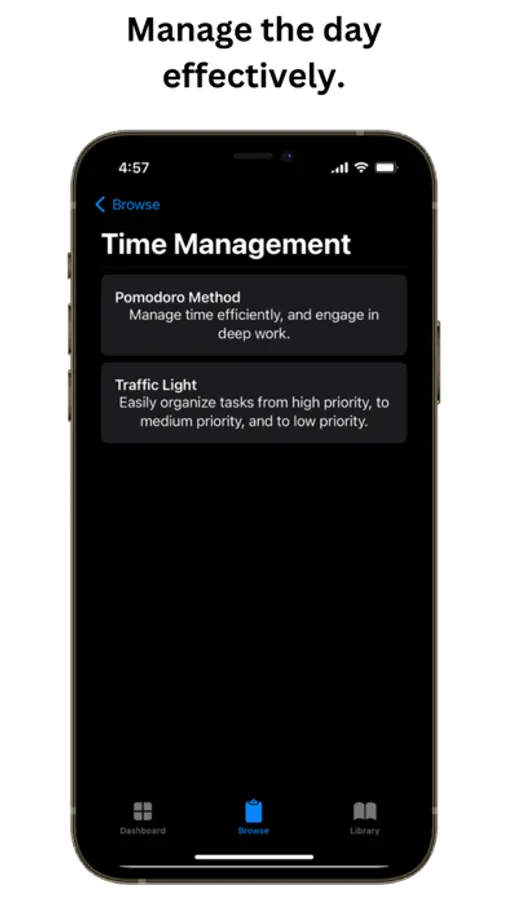 - Time Management features two popular tools: the Pomodoro and traffic light method. Use these techniques to break down tasks into manageable chunks and stay focused and productive.