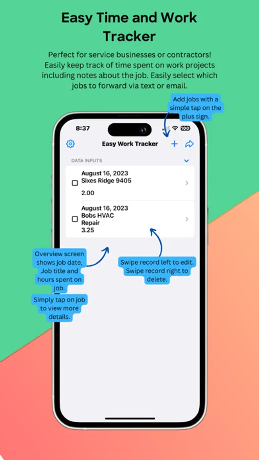 Easy Time and Work Tracker is a simple app to help anyone that needs to keep track of work projects. If you own a Service Business (HVAC, Plumbing, Contractor, Electrician, etc) or have any other type of small business where you need to keep track of various work projects in a simple easy to use app, Easy Time and Work Tracker is the app for you.