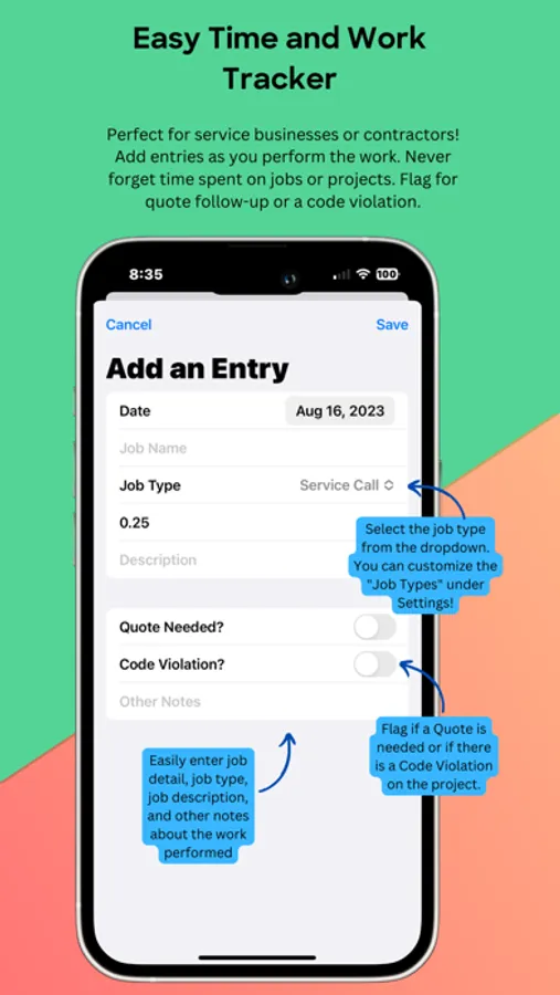 How does it work? Simply tap the "plus" icon to get started entering your project details, including a description about each project, amount of time spent on the project, if a quote is needed, if the project has a code violation and any other additional notes on the project. It's also very easy to edit the "Service Types" used in the dropdown for your own requirements and use it to keep track of your projects.