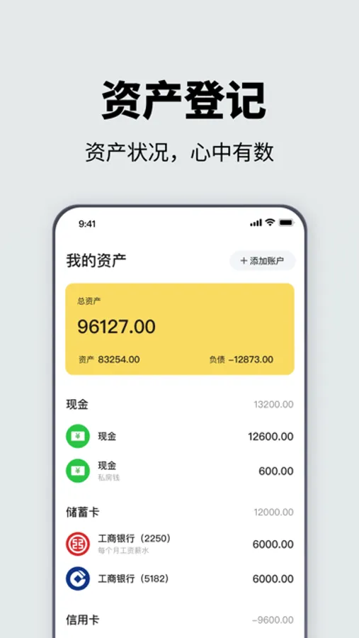 支持银行卡、信用卡、微信、支付宝、现金等账户,多渠道统一登记哥账户余额,资产心中有数;
