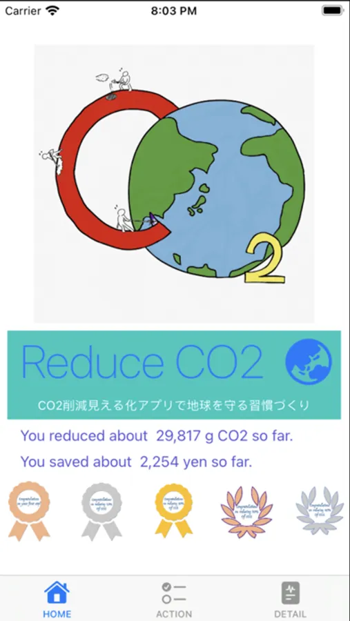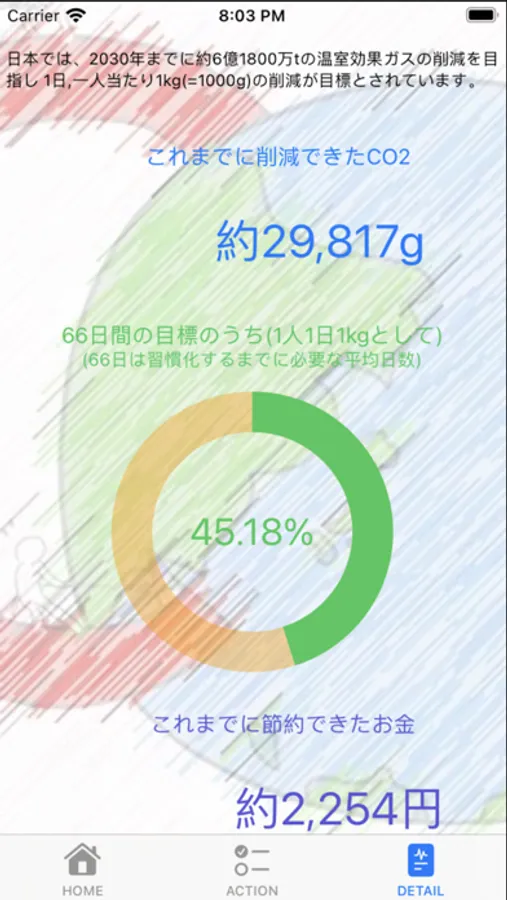 University College Rondon のPhillippa Lally博士がEuropean Journal of Social Psychologyの中で書かれた論文”How are habits formed: Modelling habit formation in ther real world"によると、習慣化するまでに必要な日数の平均は66日間とのことです。そこで「(1人1日1kg×66日)=66kgのCO2削減」を100%の達成度とし、パーセンテージを円グラフで見える化したり、達成度に合わせてホーム画面にバッジが表示されるようにしたり、稚拙ながらモチベーションが続くことを目指す工夫もいたしました。無意識の行動の意識化・見える化・習慣化を目指します。