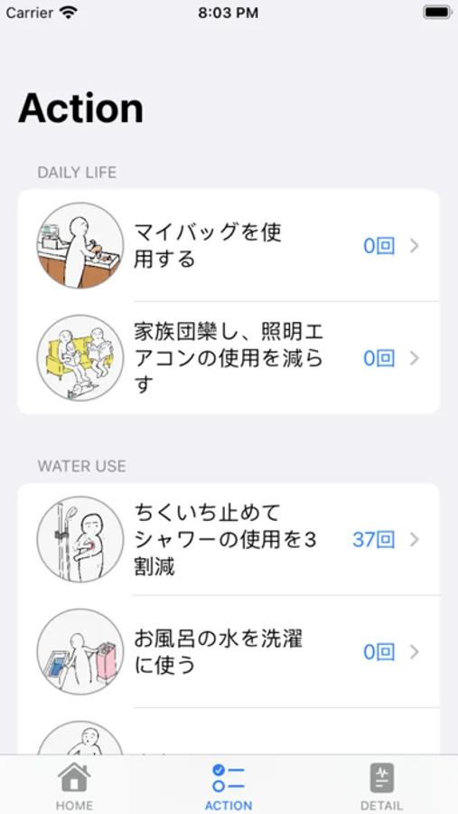 環境庁”家庭で出来る温暖化対策”などを参考に、温室効果ガスの削減効果が期待できる行動(個人)を「日常生活」「水の使用」「エネルギーの使用」「車の使用」で大きく分類し、一人一人が自分にできるカテゴリーにおいて 二酸化炭素削減を目指し、地球に優しいActionを選択することを習慣化できるまでの補助的な存在になればと願います。