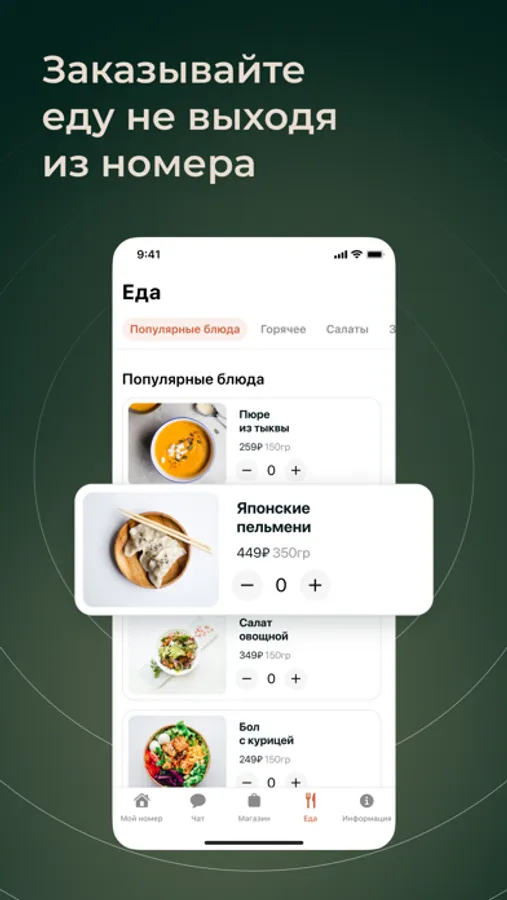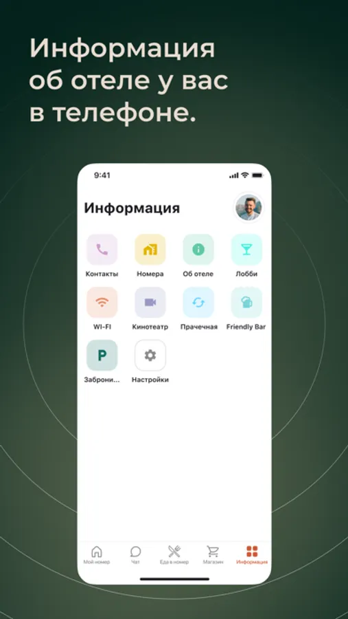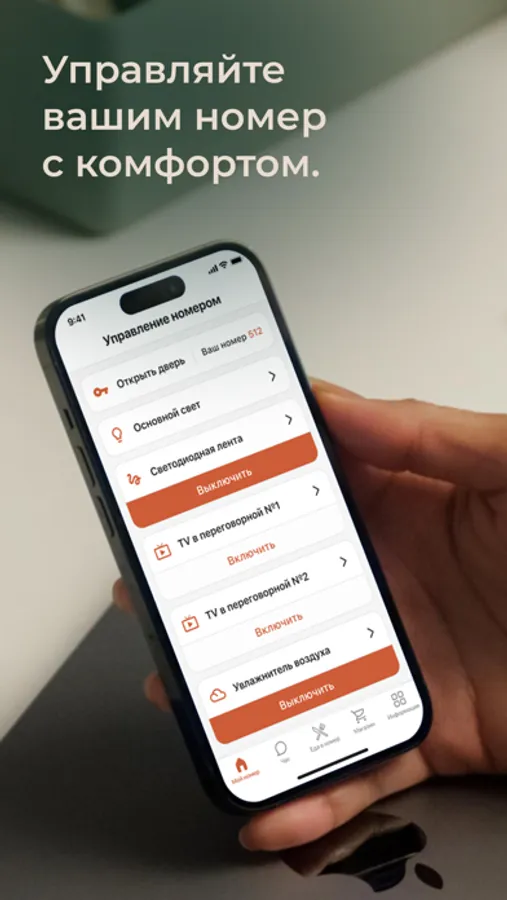 - Заказ дополнительных услуг отеля и еды в номер;