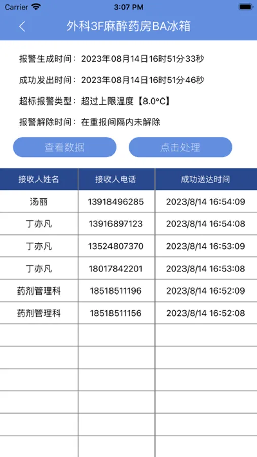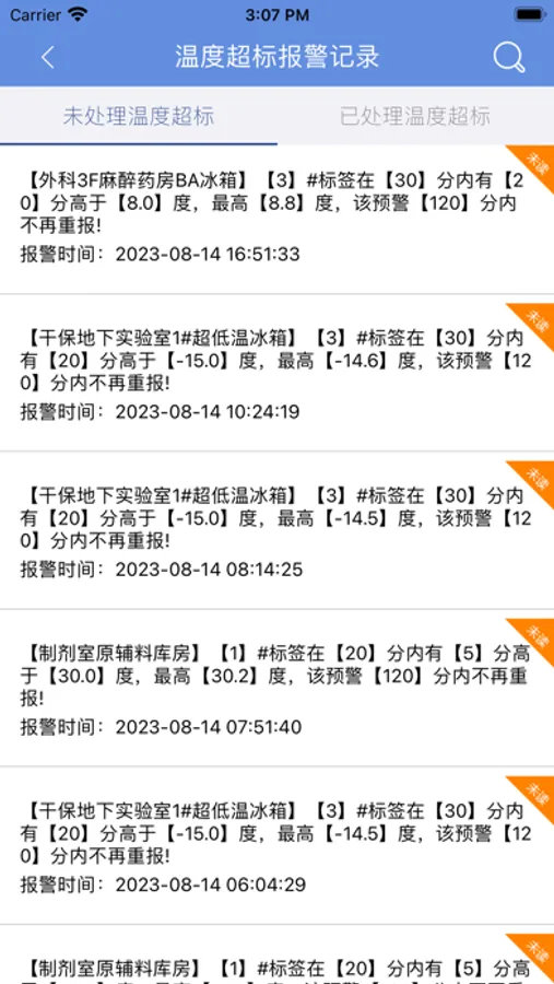 手机APP可以实时查看未处理/ 已处理温度超标报警信息以及对应详情、对应曲线并处理。