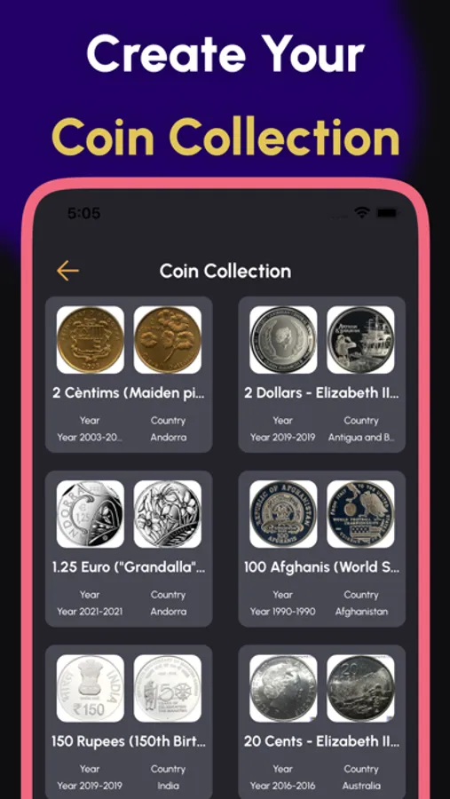 - Coin Identification: Have a coin you can't quite place? Simply snap a photo or upload an image of the coin, and app's advanced image recognition technology will quickly identify the coin's origin, denomination, and other important details.