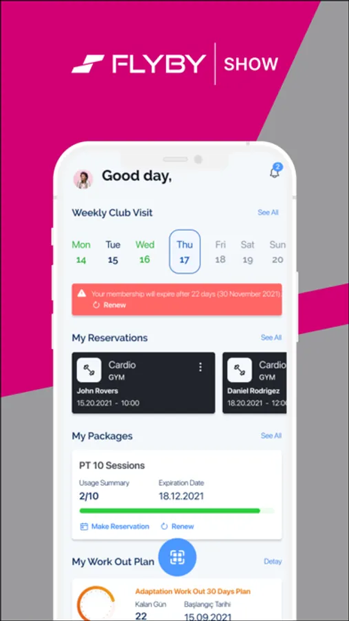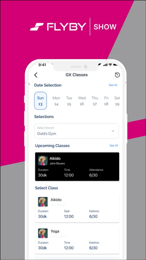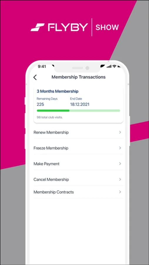 FlyBy SHOW üyeliğinizi yönetmek için kullanılan bir IOS uygulamasıdır. Müsteri Programları, Ölçümleri, Rezervasyon Alma, Hizmet Satın Alma, Stüdyo Ders İşlemlerini gerçekleştirebilen Senkron Yazılım tarafından üretilmiş bir IOS uygulamasıdır.