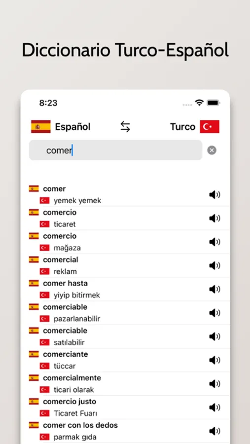 - Posibilidad de buscar a partir de palabras en Español o Turco