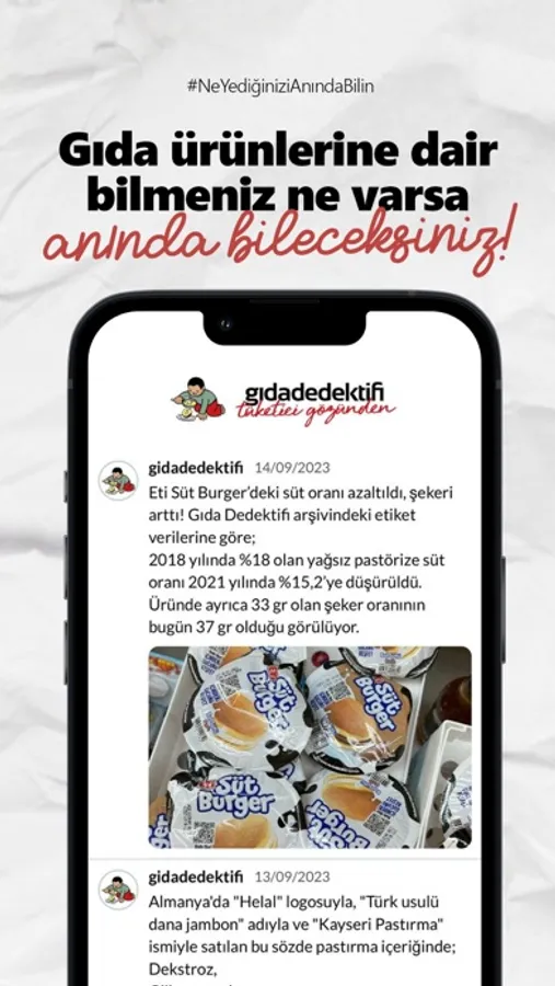Gıdanın sosyal medyasını kurmak adına attığımız ilk adımda yanımızda olun, Gıda Dedektifi Mobil uygulamayı hemen indirin ve kullanmaya başlayın.