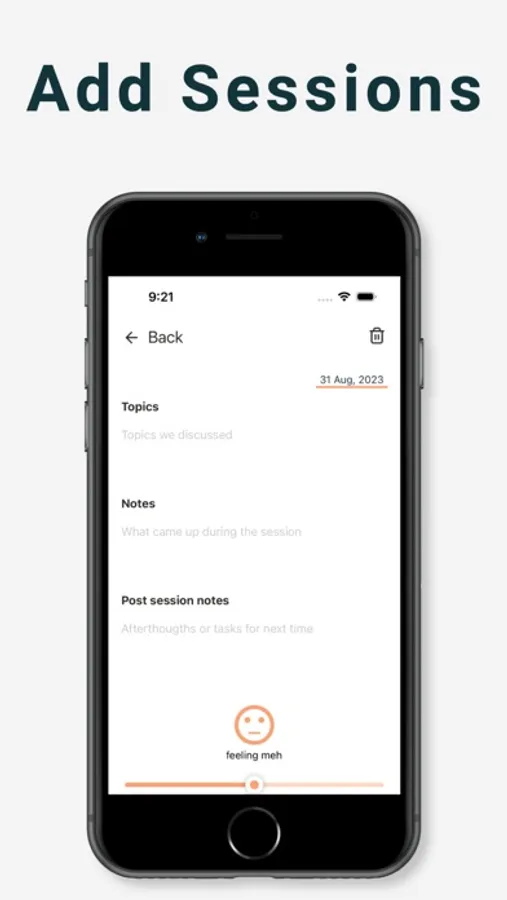 Therapy Notes: Document your thoughts and reflections after each therapy session. Capture the insights, breakthroughs, and emotions you experience during your therapeutic journey. Our intuitive interface makes it easy to write, edit, and organize your notes.