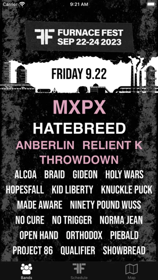 * Stage schedules -- see up-to-date schedules for Furnace Fest. Swipe between the fest's three days and tap on any of the band times to add that set to your phone's calendar so you don't miss any of the bands you wanna see!