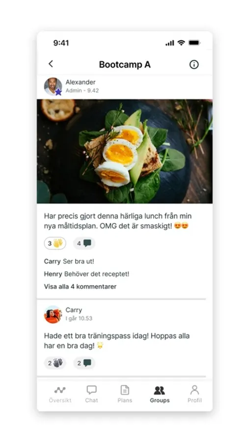 Din coach kan skapa communities för sina klienter genom att skapa grupper. Gruppmedlemmar kan dela med sig av tips, ställa frågor och stötta varandra. Det är frivilligt att delta, ditt namn och din profilbild kommer bara att vara synliga för andra gruppmedlemmar om du väljer att acceptera inbjudan från din coach.