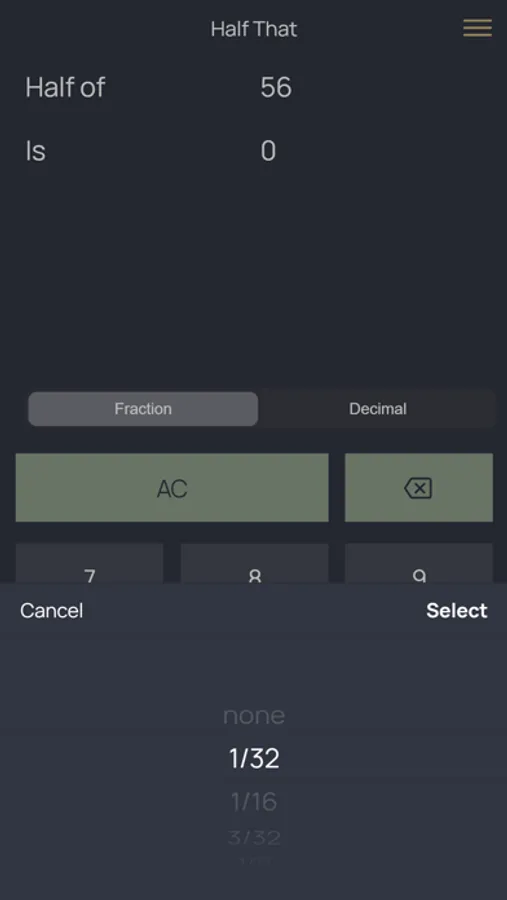 Simply enter a number to calculate half that number. Great for crafts, woodworking, construction, and more! Allows you to enter decimals or fractions (up to 32nds).