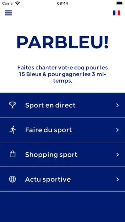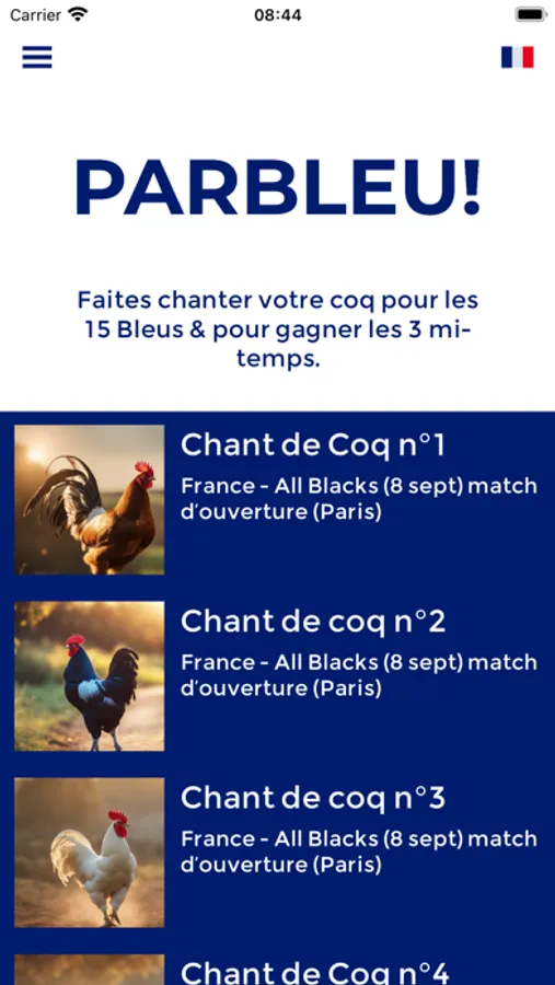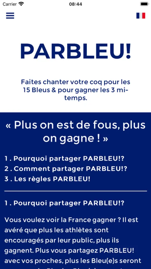 Avec l’application mobile PARBLEU! Chargée sur leur iPhone, tous les supporters des Bleu(e)s peuvent faire résonner leurs chants de coqs dans les stades du monde entier ; c’est la nouvelle solution simple et pratique dans la panoplie des fans du sport français. L’application mobile PARBLEU! s’adapte à l’actualité sportive et se met aux couleurs des grands événements internationaux périodiques, mais reste disponible et utilisable 365 jours par an pour toutes les compétitions, même mineures.