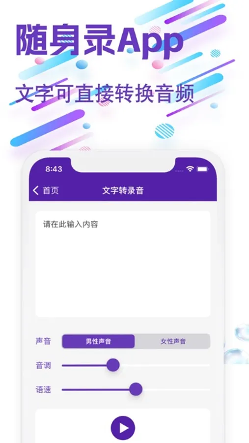 3、文字转语音:文字转换语音,输入您需要的文字,可以转换为男士或者女士声音,可以调整语速等配置,让您的声音更加自主;