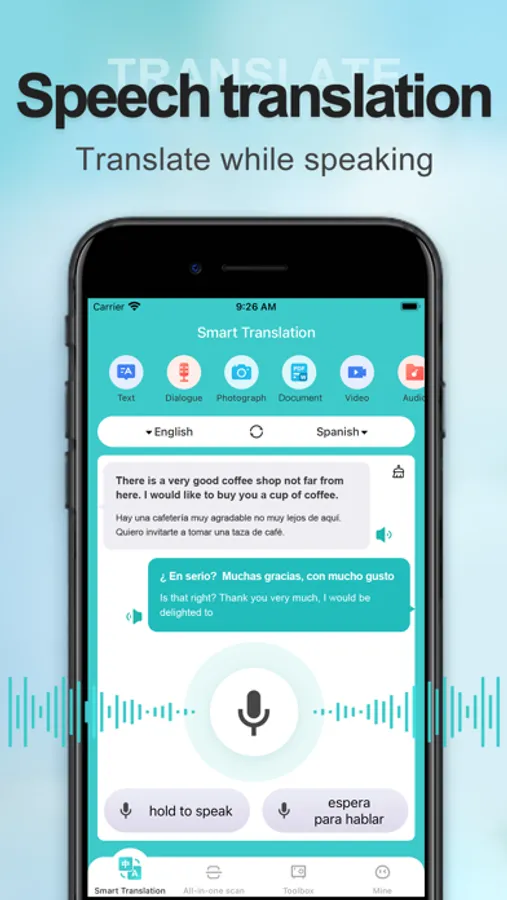 Real-time speech intelligent capture and recognition of translated speech, and foreign friends easily face to face communication.