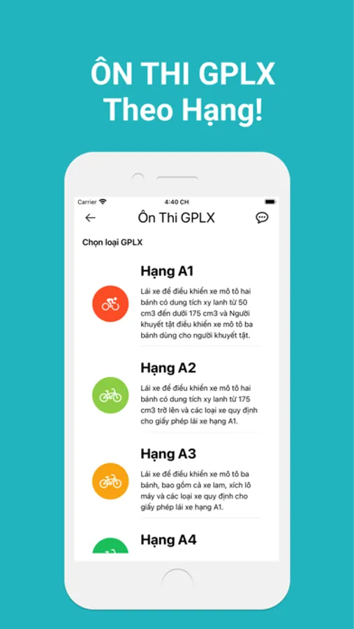 + Bộ câu hỏi ôn thi sách hạch bằng lái xe hạng A1, A2, A3, A4, B1, B2, C, D, E, F với bộ đề thi ngẫu nhiên theo cấu trúc chuẩn đề thi của Tổng Cục đường bộ Việt Nam Bộ GTVT, biết được kết quả đạt hay không nhanh chóng với bộ đề thi chính xác.