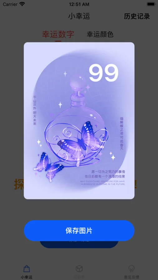 日记: 您可以随时记录每一天的幸运数字、色彩和自己的心情,将这些宝贵的回忆记录在应用中。日记记录都支持加密存储,保障您的隐私安全。