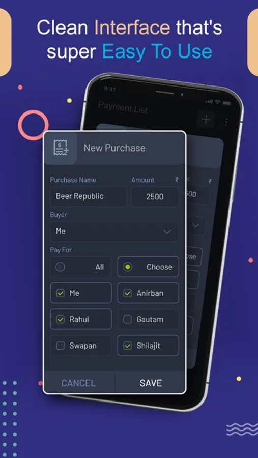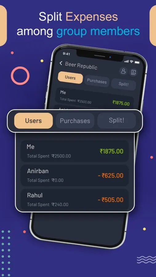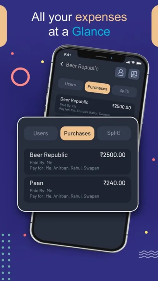 No more fiddling about with change, lost receipts, or disagreements about the expenses. Simply enter all your users and Purchases and Usplit shows you who owes how much to whom.