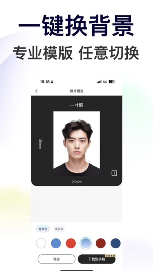 【背景替换】你可以从丰富的背景色中任意选择,AI证件照将会自然融合你的形象和背景,保证最终效果自然真实。